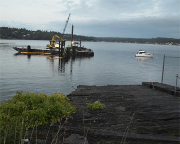 The old Fox Island Ferry landing is in the last stages of removal, at the corner of 9th & Fox Drive. Contractors working for the Department of Natural Resources are removing the creosote pilings that once made up the old ferry dock that brought cars to &