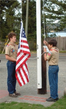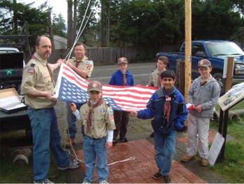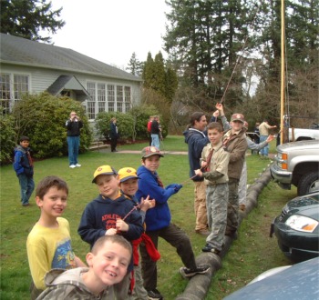Above: Pack 202's Cub Scouts hoist the new flagpole into place.