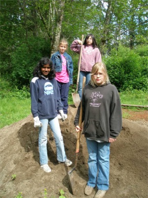 Tess, Sarah Aliya, and Heather stand atop the pile of dirt to be